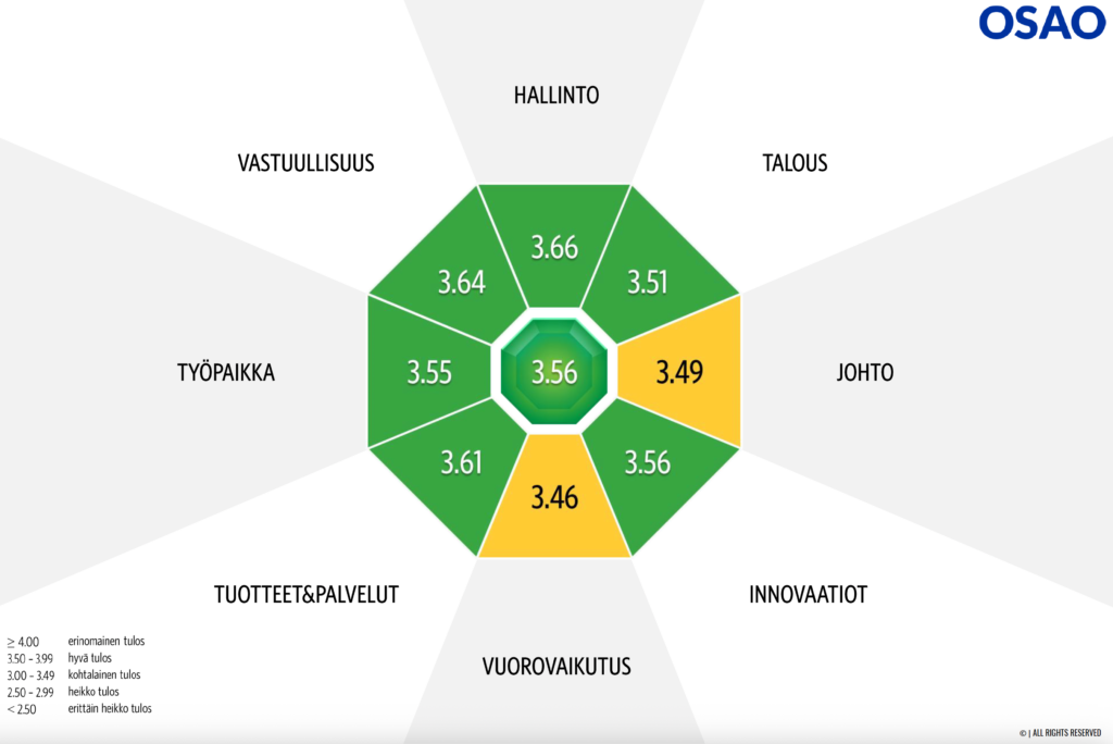 OSAOn maine rakentuu useista vahvoista osa‑alueista. Korkeimmalle arvioitu osa‑alue on hallinto (3,66). Myös tuotteet ja palvelut kuuluvat maineen vahvimpiin osa‑alueisiin (3,61), ja OSAOn osaamista ja koulutustarjontaa koskeva kokonaisarvio on hyvällä tasolla.