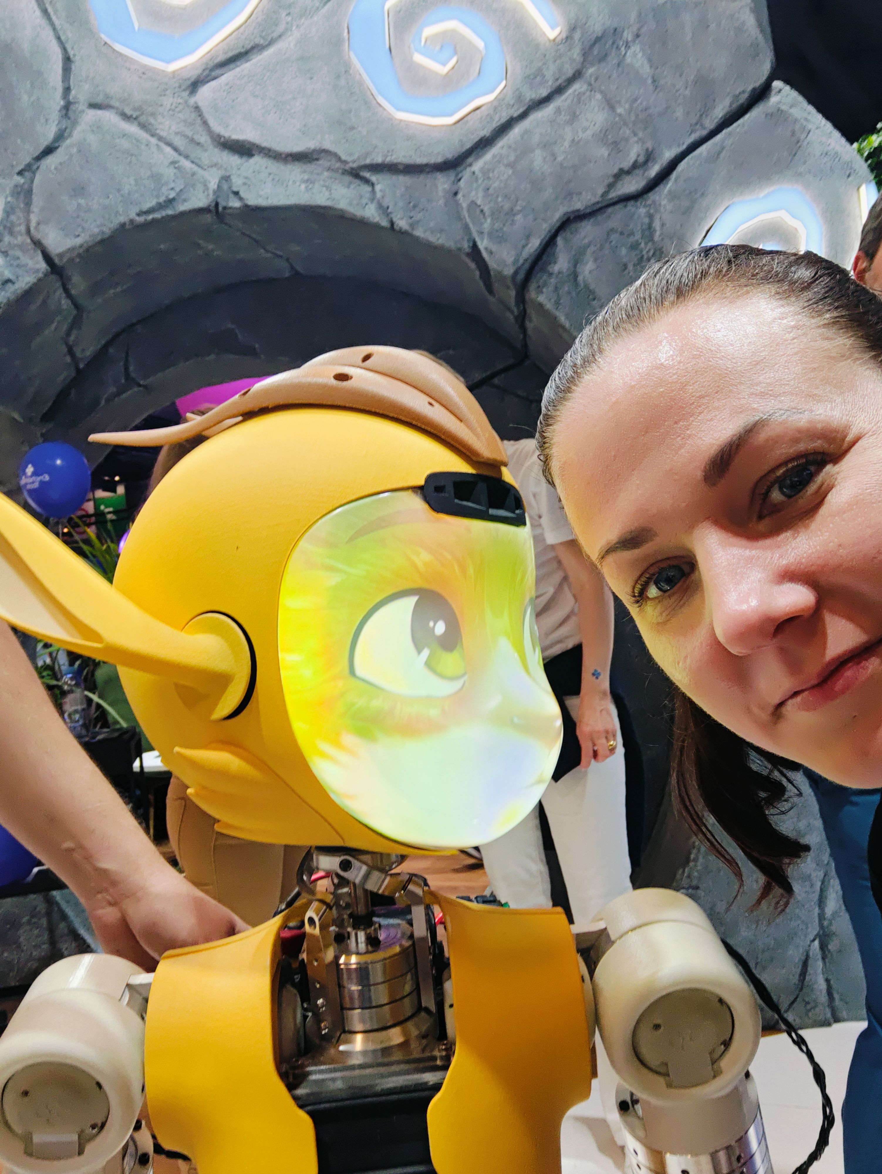 Blue Frog -yrityksen Buddy-robottiin olimme päässeet tutustumaan jo aiemmin etäyhteyden välityksellä. Olimme sopineet messuille tapaamisen, jossa saimme koekäyttää Buddy-robottia sekä keskustella siihen liittyvistä kysymyksistä. Buddy on vuorovaikutuksellinen, sosiaalinen robotti, jonka sisälle on integroitu tekoäly. Buddy on yleisilmeeltään sympaattinen – kosketussensorit antavat robotille erilaisia ärsykkeitä, joiden avulla Buddy tekee ”temppuja”. Buddy voisi toimia palvelukodissa sosiaalisena, vuorovaikutusta ylläpitävänä robottina, joka voisi kehottaa asukkaita vaikkapa pelihetkeen tai liikkumaan. Kotihoitoympäristössä Buddy voisi toimia vuorovaikutuksen tukena ja mahdollistaisi sosiaalisia kanssakäymisiä esimerkiksi yksinäisille ikääntyneille.